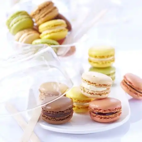 Sucre – AMANDES en poudre 19% – Blancs d’OEUFS 17% – CREME – Sirop de glucose – Chocolat noir 1.7% (pâte de cacao, sucre, beurre de cacao) – Brisures de framboises 1% – Amidons – Blancs d’OEUFS en poudre 1% – Jus de citrons 1% – LAIT en poudre écrémé – Purée de pommes – Citrons 0.3% – BEURRE – Purée de PISTACHES 0.2% – Concentré de jus de betterave – Gélifiant : pectines – Sucre caramélisé – Concentré de curcuma – Arôme naturel de vanille – Concentré de carottes et d’hibiscus – Café soluble 0.04% – Stabilisant : gomme xanthane – Extrait de spiruline – Arôme naturel de PISTACHE – Gousses de vanille épuisées broyées.