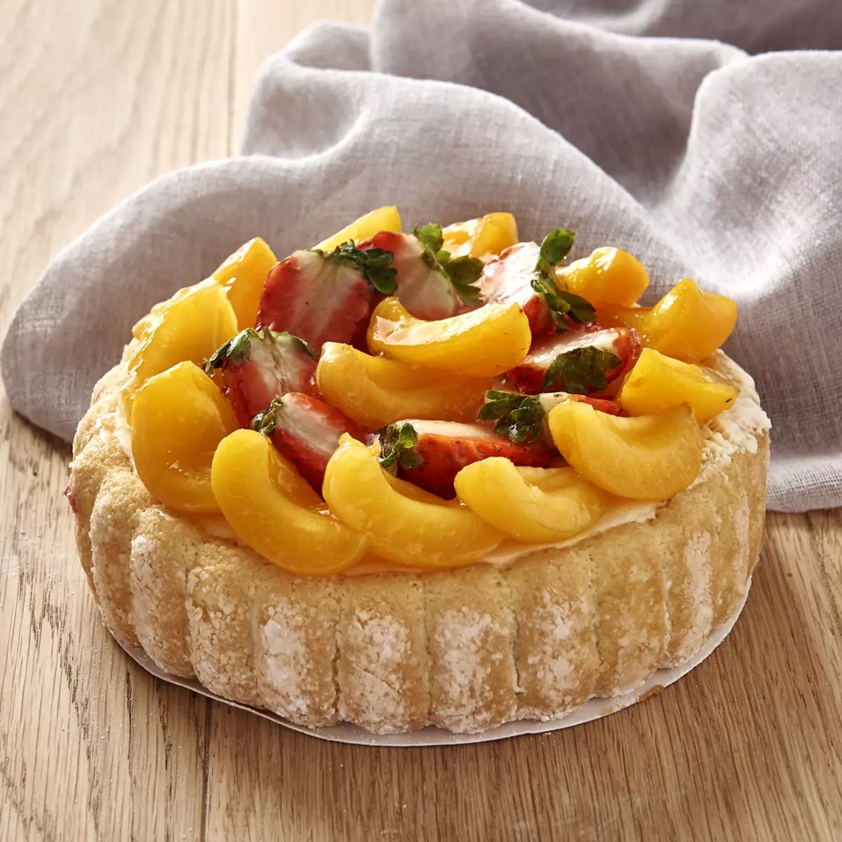 CREME anglaise(LAIT écrémé, sucre, CREME, matière grasse LAITIERE, amidon modifié, jaune d’OEUF, arôme vanille, stabilisant: E331 E407, émulsifiant: E471, sel, colorant: E160a), CREME(CREME de LAIT, stabilisant: E407), eau, purée d’abricot 9%(abricot, eau, sucre, antioxydant: E300), sucre, farine de BLE, blanc d’OEUF(gélifiant: E412), jaune d’OEUF, gélatine, sirop de glucose fructose, sucre glace(antimottant: amidon de pomme de terre), arôme naturel vanille, sel), fruits assortis 26%, nappage blond(eau, sirop de glucose(BLE), sucre, fructose(BLE), gélifiant: E440 E407, colorant(extraits de carotte et de paprika, jus de sureau), acidifiant: E330, arôme fraise)