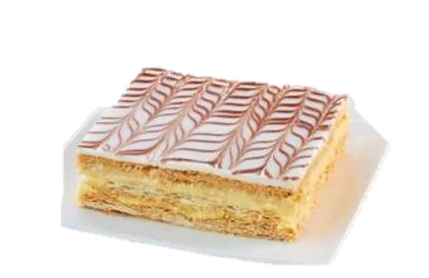 CREME pâtissière 49% (eau, sucre, LAIT écrémé en poudre,amidon de mais, amidon modifié, colorant: E160a, arôme, sel, colorant issu d’extraits végétaux, OEUF), feuilletage 28% (farine de BLE, BEURRE, eau, sel), fondant (sucre, sirop de glucose, eau), crème au BEURRE(BEURRE(47%), sucre, OEUF, eau), nappage blond (eau, sirop glucose, sucre, fructose, gélifiant: E440 E407, acidifiant: E330, arôme abricot,colorant végétal (extrait végétaux de tagete et de paprika)), AMANDES effilées, bigarreau(bigarreaux, sirop de glucose fructose, saccharose, acidifiant: E330, colorant: E127, conservateur: E202 E220(SULFITE)), pâte de cacao