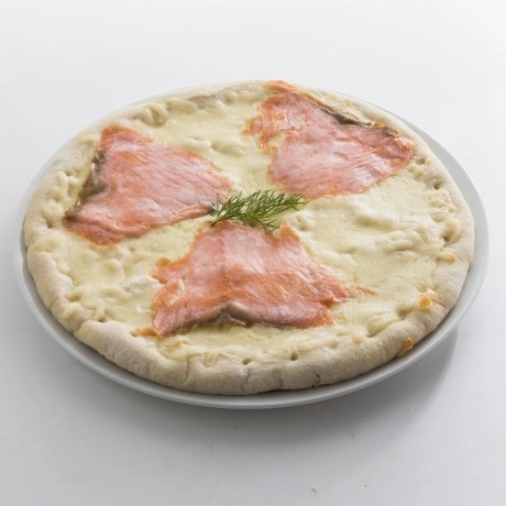 Pizza à base de Mozarella, saumon fumé et aneth.
